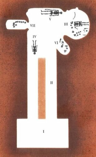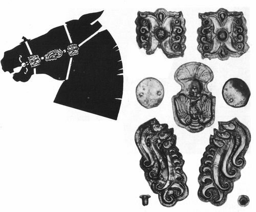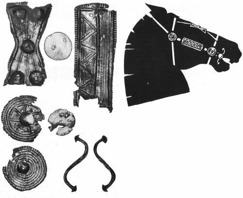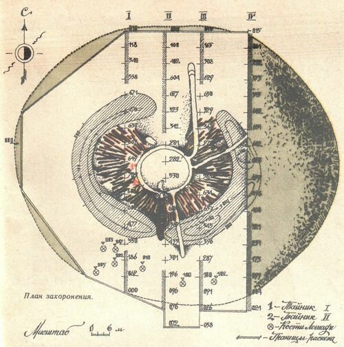 ІV-VIII - кінські могили і поховання конюхів; IX - майданчик, де відбувалась тризна;