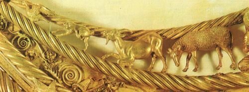 Вага пекторалі 1150 гр. Діаметр 30,6 см. Три напівкруглих фризи, які утворюють пектораль, заповнені рослинним орнаментом, численними, литими із золота зображеннями людей і тварин.