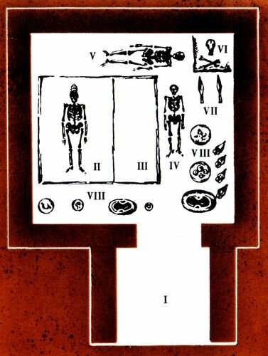 І - первісна вхідна яма; ІІ - вторинний вхід до могили;