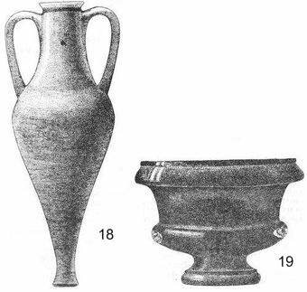 1, 2, 3, 4 - бронзові наконечники стріл з сагайдачного набору; 5 - намисто із золотих біконічних намистин і золотих підвісок; 6 - золоті сережки; 7 - золоті персні; 8 - срібний браслет; 9 - пов'язка з пастових намистин; 10 - наконечник списа; 11 - наконечник дротика; 12, 13 - залізні ножі з кістяними руків’ями; 14, 15 - залізні скоби від підноса; 16 - бронзове дзеркало; 17 - підток списа; 18 - амфора з фасоським клеймом; 19 - чорнолаковий канфар