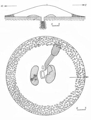 Підземелля гробниці мало протяжність до 10 м і більше. При зведенні великих курганів насип споруджували з пластів нарізаного дерну або з мулких вальків і обкладали по основі каменями. Найвеличнішими були царські кургани, висота яких доходила до 18-22 м.
