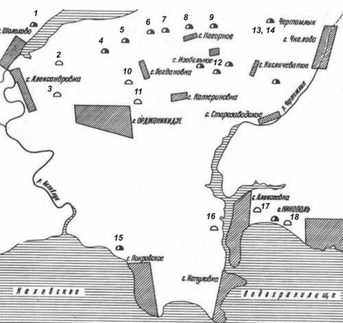 2 - Західно-Богданівська група. Поховання IV ст. до н.е. 3 - Курганна група шахти № 22. Поховання V-IV ст. до н.е. 4 - Група Степового кургану. Поховання IV ст. до н.е. 5 - Група Страшної Могили. Поховання V (Чабанцова Могила) - IV ст. до н.е. 6 - Група Завадських Могил. Поховання V ст. до н.е. 7 - Група Лисячої Могили. Поховання V-III ст. до н.е. 8 - Курганний могильник біля с. Нагорне. Поховання бронзового віку і IV-III ст. до н.е. 9 - Група Іспанових Могил. Поховання V-IV ст. до н.е. 10 - Група біля Богданівської збагачувальної фабрики (БЗФ). Поховання IV-III ст. до н.е. 11 - Товста Могила. Поховання IV ст. до н.е. 12 - Група Дідової Могили і Курганна група Лаурки (район с. Ізобільне). Поховання бронзового віку і V-IV ст. до н.е. 13 - Курган Чортомлик. Поховання IV ст. до н.е. 14 - Курганна група в 5 км на захід від с. Чкалове. Поховання бронзового віку і V-IV ст. до н.е. 15 - Курганний могильник на північний захід від с. Покровське (група Сторожової Могили).