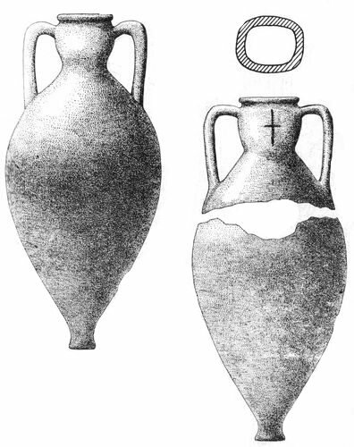 Обидві амфори розрізнялися лише в деталях. Так, одна з них мала яйцеподібний корпус з похилими плічиками, невисоке сильно роздуте у верхній частині горло і невисоку масивну ніжку, яка розширювалася, з глибокою виїмкою знизу. На плечику амфори, по лінії підстави однієї з ручок, була смуга, нанесена червоною фарбою. Висота амфори складала 68 см, діаметр корпусу - 32 см, вінчика - 11,5 см, висота горла - 12 см. Друга амфора збереглася гірше і була не набагато вужча і вища попередньої. На її горлі з обох боків чорною фарбою було нанесено по хресту. Висота другої амфори складала 70 см, діаметр корпусу - 30 см. ![]()