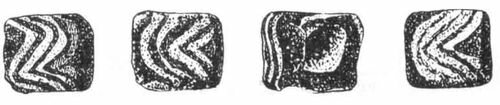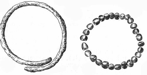 Одну з найпоширеніших груп імпортних виробів в IV-III ст. до н.е. складали скляні намиста. Основні центри їх виготовлення, мабуть, знаходилися в Середземномор'ї і Малій Азії. У курганній групі Капулівка II (Нікопольський район) при розкопках кургану № 1 був виявлений браслет, діаметром 7,5 см, зроблений з круглої в перетині проволоки з незімкнутими кінцями, які заходили один за одного. Перев’язь була набрана з 27 невеликих скляних намистин. ![]()