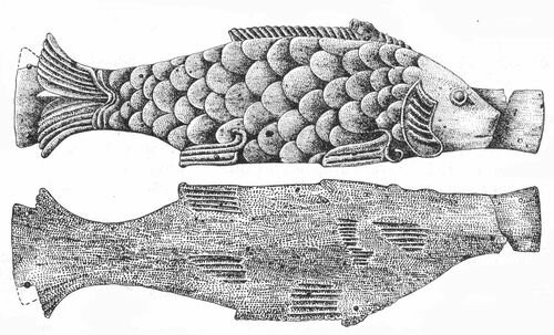 У розвалинах Херсонеса, Ольвії, Фанагорії і інших грецьких міст-держав до цих пір збереглися залишки кам'яних ванн для засолки риби. Відомі також чеканні зображення голови осетра на стародавніх монетах. Все це говорить про господарську цінність осетрових в античні часи. Описуючи землі скіфів, Геродот згадує про білуг і осетрів, які удосталь зустрічалися в ті часи в дніпровських водах. Думаю, саме осетрових Полібій, Страбон і інші стародавні автори зараховували, перш за все, до хороших сортів риби. Купці з Ольвії, що контролювали гирло Борисфену, очевидно користувалися пріоритетом в торгівлі зі скіфами. З Ольвії мариновану скіфську рибу поставляли до Греції і інших районів Середземномор’я. Не можу погодитися з тими авторами, які стверджують, ніби-то риба була мало не другорядною статтею скіфського експорту, мотивуючи це тим, що «кочівникам не властиве заняття рибним промислом». Історичні документи, зокрема, Іпатьївський літопис, спростовують подібну точку зору. У вже згаданому літописі розповідається про те, що половецький хан Сарчак, розгромлений Володимиром Мономахом, відступивши в Придонські степи, «рибою оживши».Вірогідніше за все, доходи від торгівлі рибою складали в бюджеті скіфської знаті значну статтю, поступаючись лише прибутку від продажу пшениці. До того ж, в посушливі і неврожайні роки, а такі на сучасному півдні України і Кубані трапляються нерідко, тільки продаж хороших сортів риби міг значною мірою компенсувати збитки, пов'язані з вимушеним скороченням експорту зерна. ![]() Знайдена у групі шахти № 22 (Нікопольський район) бронзова бляха у вигляді риби,