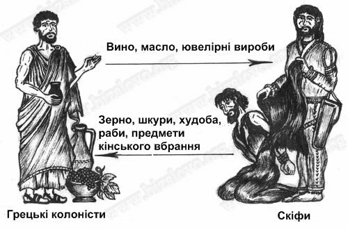 Скіфи вели жваву торгівлю з грецькими містами-державами, які виникли у Північному Причорномор'ї і в Криму на межі VII-VI ст. до н.е. Вони поставляли грекам зерно, шкури, худобу, рабів і в обмін на них отримували ювелірні вироби, вино, масло.