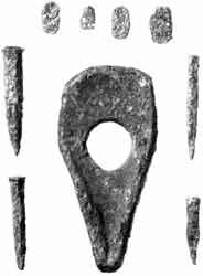 Залізні вироби з Кам'янського городища під Нікополем: молоток-пуансон для штампування панцирних лусок, панцирні луски, зубило, пробійники. IV-III ст. до н.е.