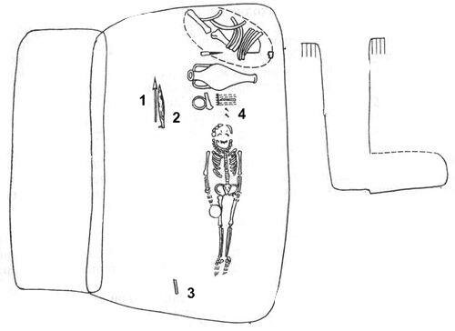Увагу археологів привернули крупні частини великого дерев'яного предмету, що лежали в північно-західному куточку поховання - швидше за все, щита. Він ніби-то був покритий білим лаком і розписаний червоною і зеленою фарбами. ![]()