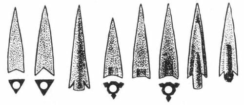 2 - наконечник стріли, 3 - свинцеве прясельце,