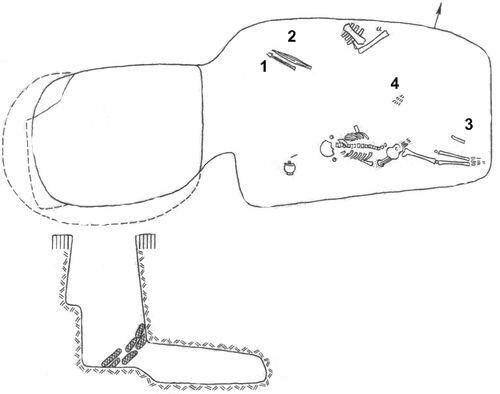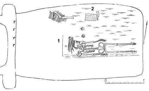 1 - залишки шкіряного сагайдака із стрілами, 2 - уламок дерев'яного щита