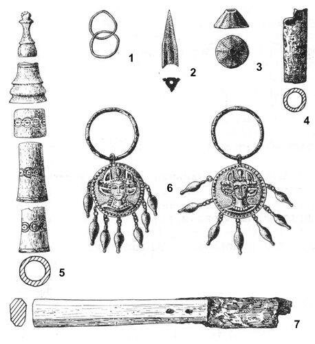 6 - срібні сережки із золотими підвісками, 7 - кістяне руків’я від залізного ножа із лезом