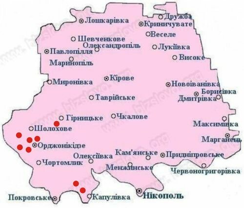 Місця знахідок на території Нікопольського району скіфських жіночих поховань зі зброєю
