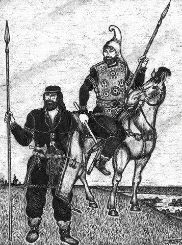 Ймовірно, згадувані в билинах мечі-кладенці являються кіммерійськими мечами, які середньовічні мешканці нашої країни могли знаходити в давніх кладах. До таких мечів відносилися з великою повагою, вважаючи їх зброєю героїчних предків. Самі собою поширювалися легенди про чарівні властивості "кладенців". Один з таких мечів був виявлений українськими археологами в кіммерійському кладі на Суботівському городищі у Чигиринському районі. Цей чудовий сталевий меч був забезпечений бронзовою хрестоподібною рукояттю, а його довжина перевищувала 1 м. ![]()
